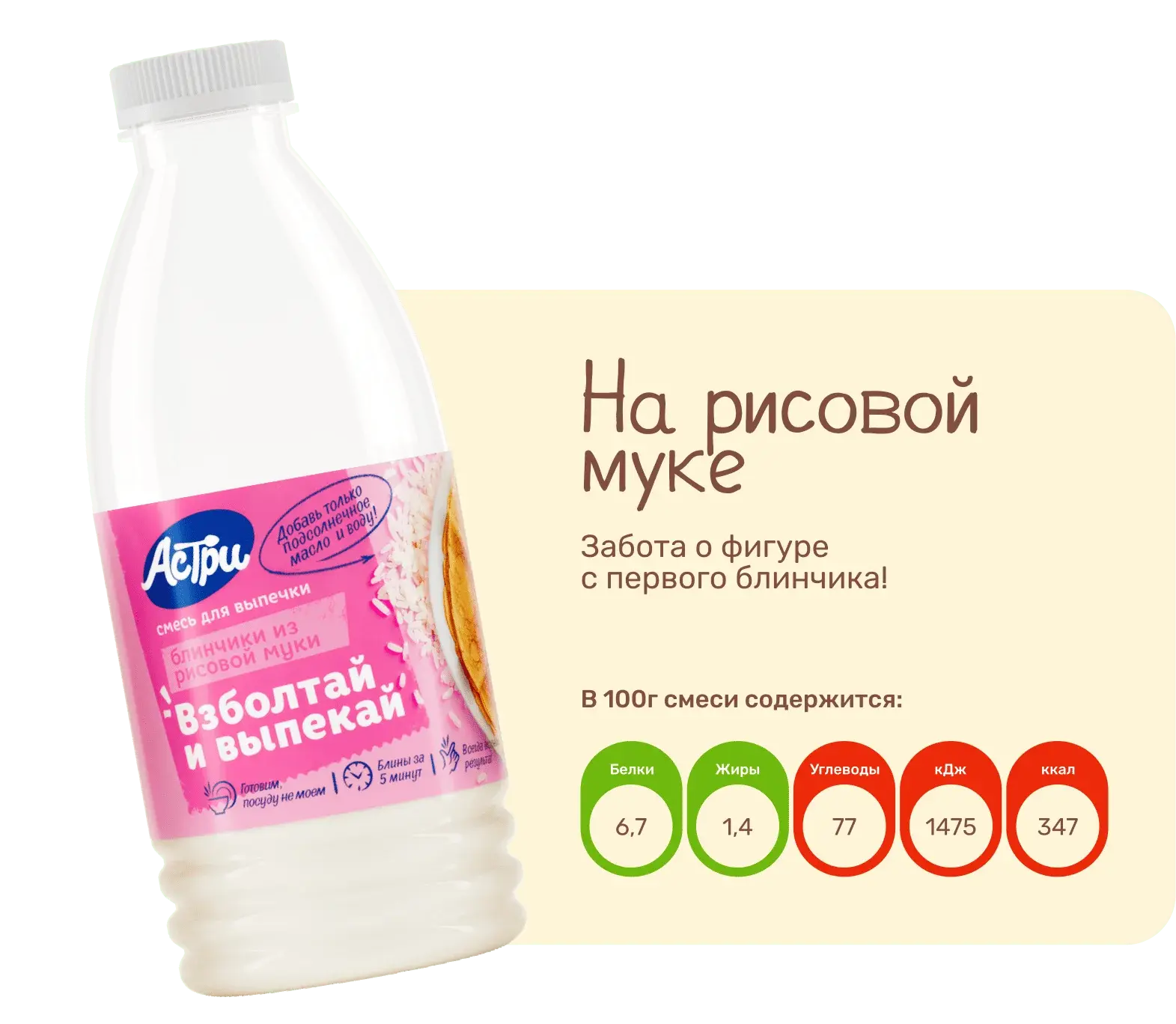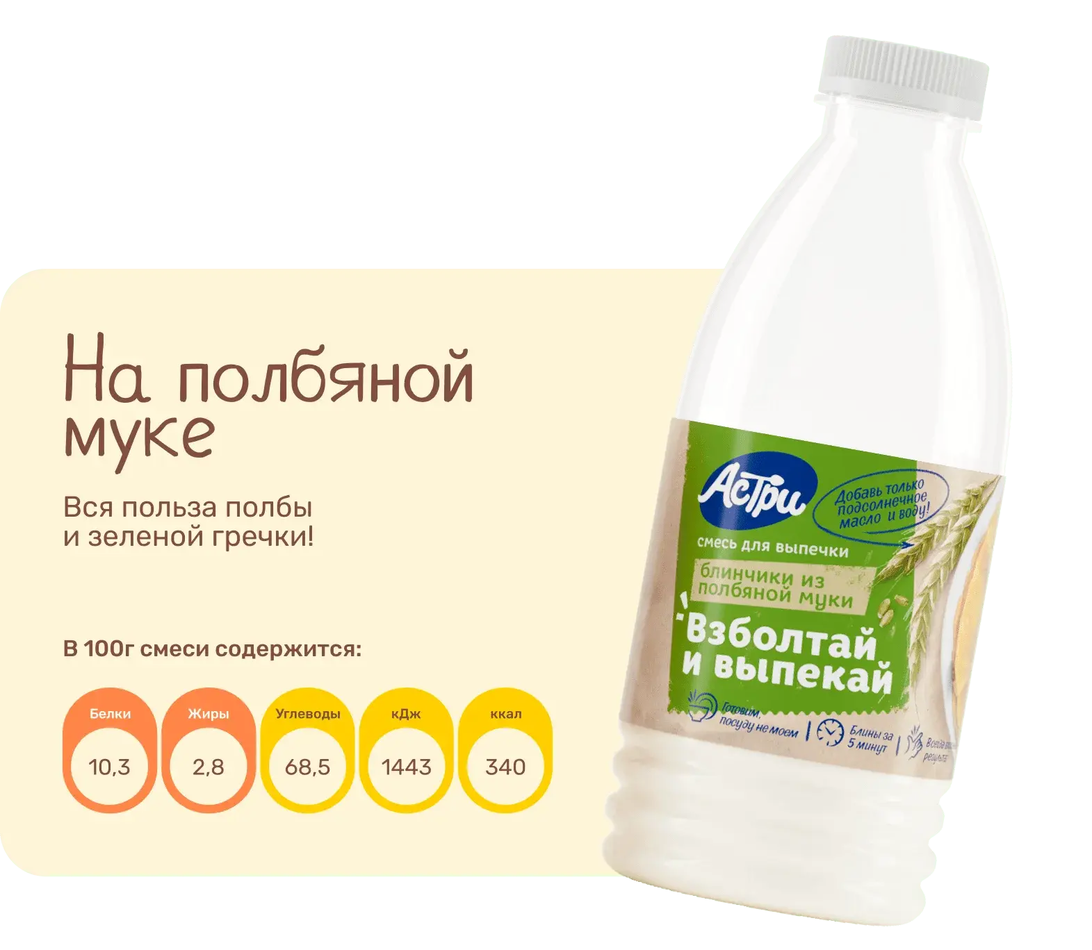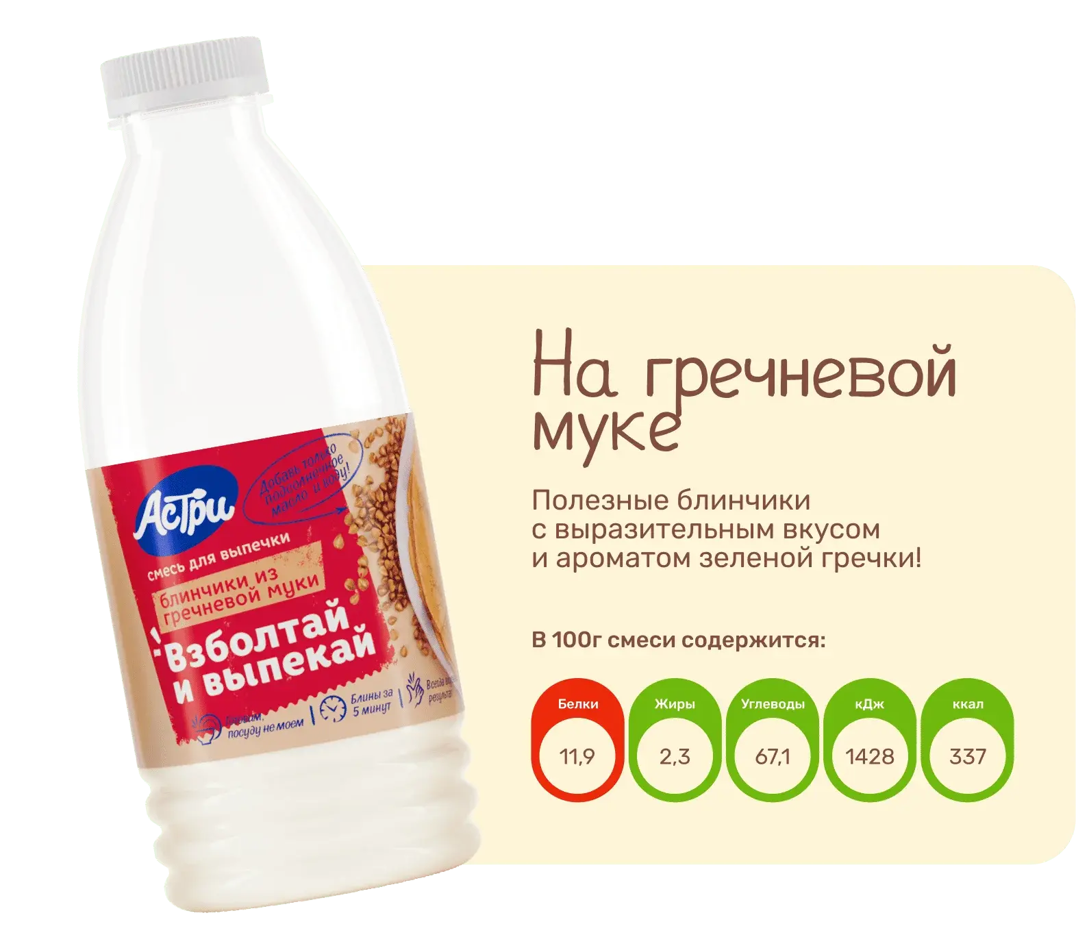 Наши смеси разработаны таким образом, что все необходимые ингредиенты уже находятся в пакетике. Не нужно тратить время на их поиски. Остаётся лишь добавить воду, масло и капельку любви, быстро перемешать и поставить выпекаться. Мы постарались сделать максимум для тебя и хорошего результата!